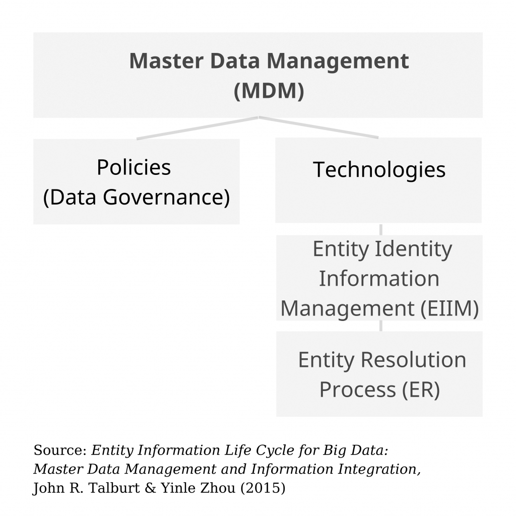 The Technology component of MDM needs to address two tasks: Entity Resolution (ER) process – when systems refer to one or more entities, this process selects information with high priority and accuracy; and Entity Identity Information Management (EIIM) – maintaining the integrity of entity identity over time, a basic requirement of MDM systems. Thus, master data management is both a technology challenge, integrating data, and an organizational strategy issue, involving the management responsibilities of relevant departments.